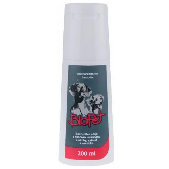 Antiparazitárný šampón BIOPET na efektívnu ochranu psov s esenciálnými olejmi z klinčeka, eukalyptu a nimby a extraktom z nechtíka.