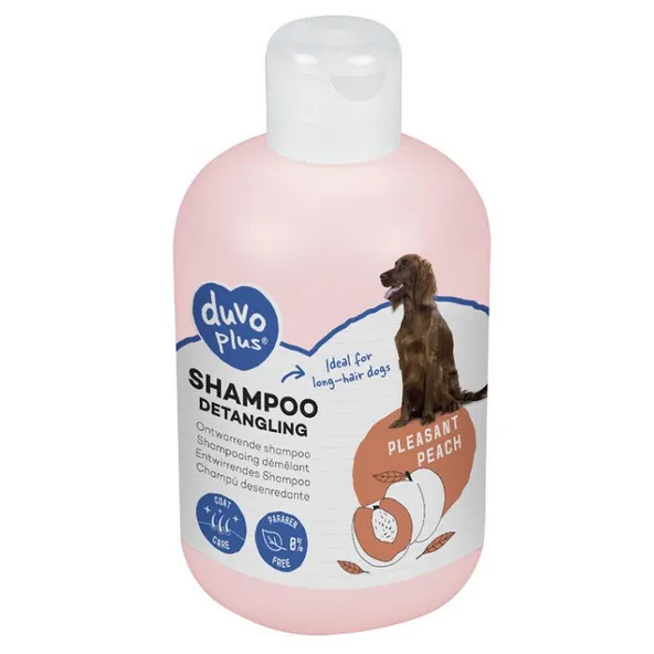 Rozptýlený broskyňový šampón od duvoplus bol vyvinutý špeciálne pre dospelých psov s dlhou srsťou.