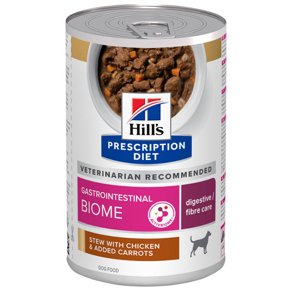 Hill's PRESCRIPTION DIET Gastrointestinal Biome Stew krmivo pre psov s kuraťom a pridanou mrkvou je vysoko stráviteľné kompletné dietetické krmivo používané na zmiernenie porúch vstrebávania živín v črevách a na kompenzáciu zlého trávenia u dospelých psov.