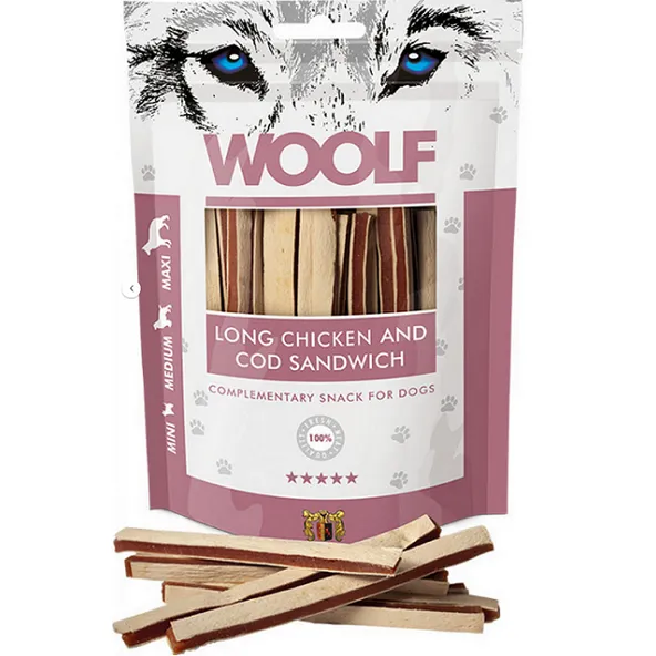 Maškrta Woolf kurací sendvič s treskou pre psy 100g