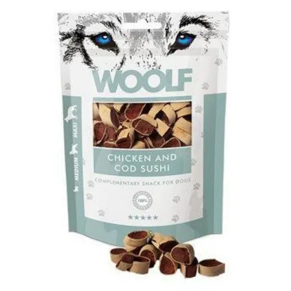 Maškrta Woolf pre psy kuracie sushi s treskou 100g