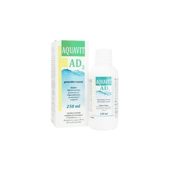 Veterinárny vitamínový prípravok Aquavit D2 pre zvieratá s obsahom v tuku rozpustných vitamínov A a D2, upravených do vodorozpustnej formy.