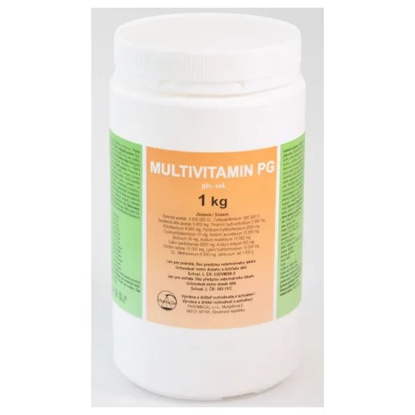 Multivitamin PG je biologicky účinný vitamínový a aminokyselinový koncentrát vhodný pre veľkochovy i drobné chovy všetkých druhov zvierat, do vody i do krmiva k doplneniu potravy, ale i k liečbe pri klinicky sa prejavujúcom nedostatku vitamínov a esenciálnych aminokyselín.