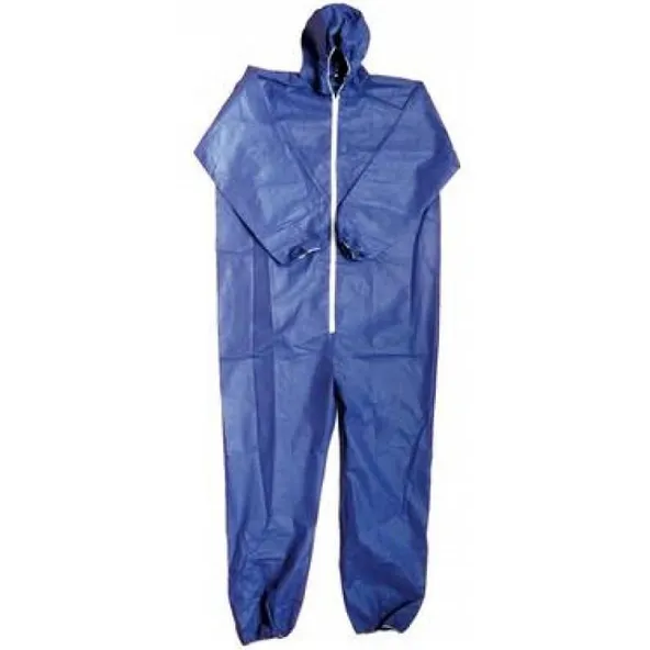 Kombinéza s elastickou kapucňou, elastické manžety a pas, zapínanie na zips, materiál 100% polypropylén, farba modrá, veľkosť XL.