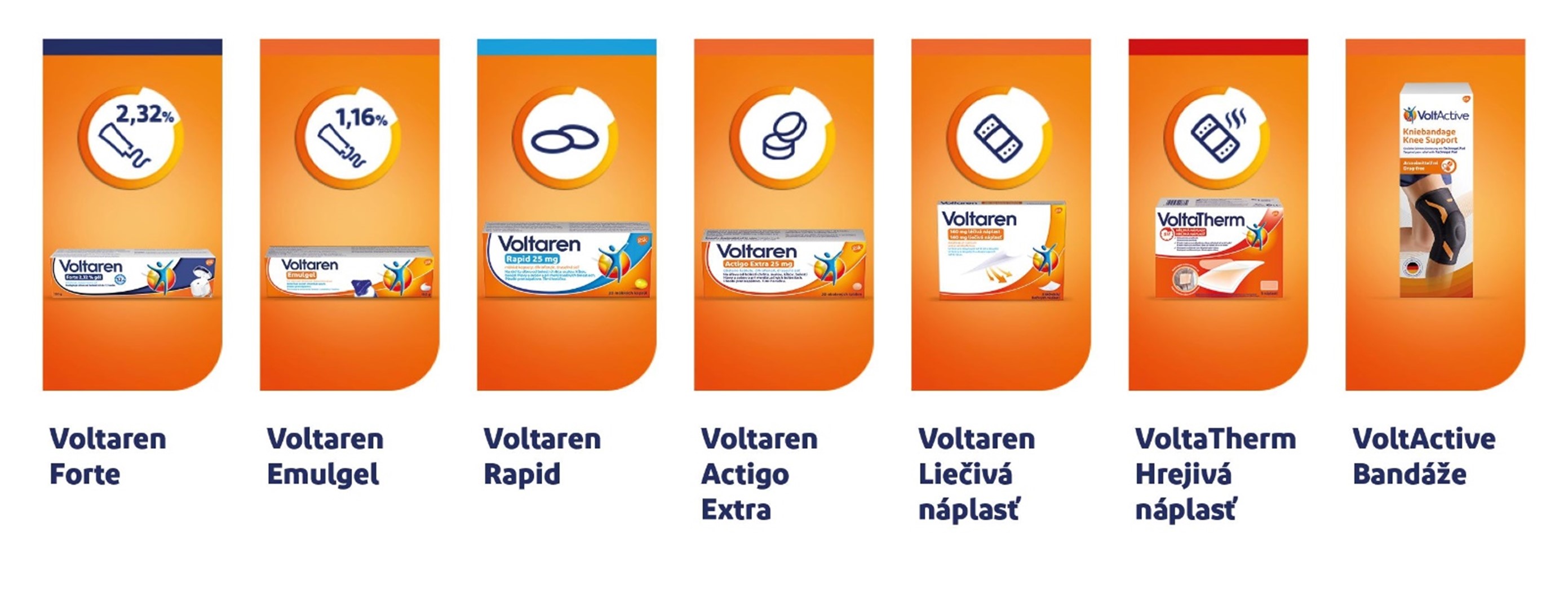 VOLTAREN ponúka voľnopredajné liečivé prípravky, ktoré obsahujú nesteroidné protizápalové liečivo (NSAID) diklofenak. Diklofenak pomáha zmierniť bolesť a tlmiť zápal tým, že pôsobí na princípe inhibície prostagladínov (= látky v tele, ktoré spôsobujú zápal a bolesť) a znižuje ich účinok. Voltaren je v ponuke v štyroch rôznych formách: gél, tablety, mäkké kapsuly a náplasť. Prečítajte si, ako každá z nich pôsobí: