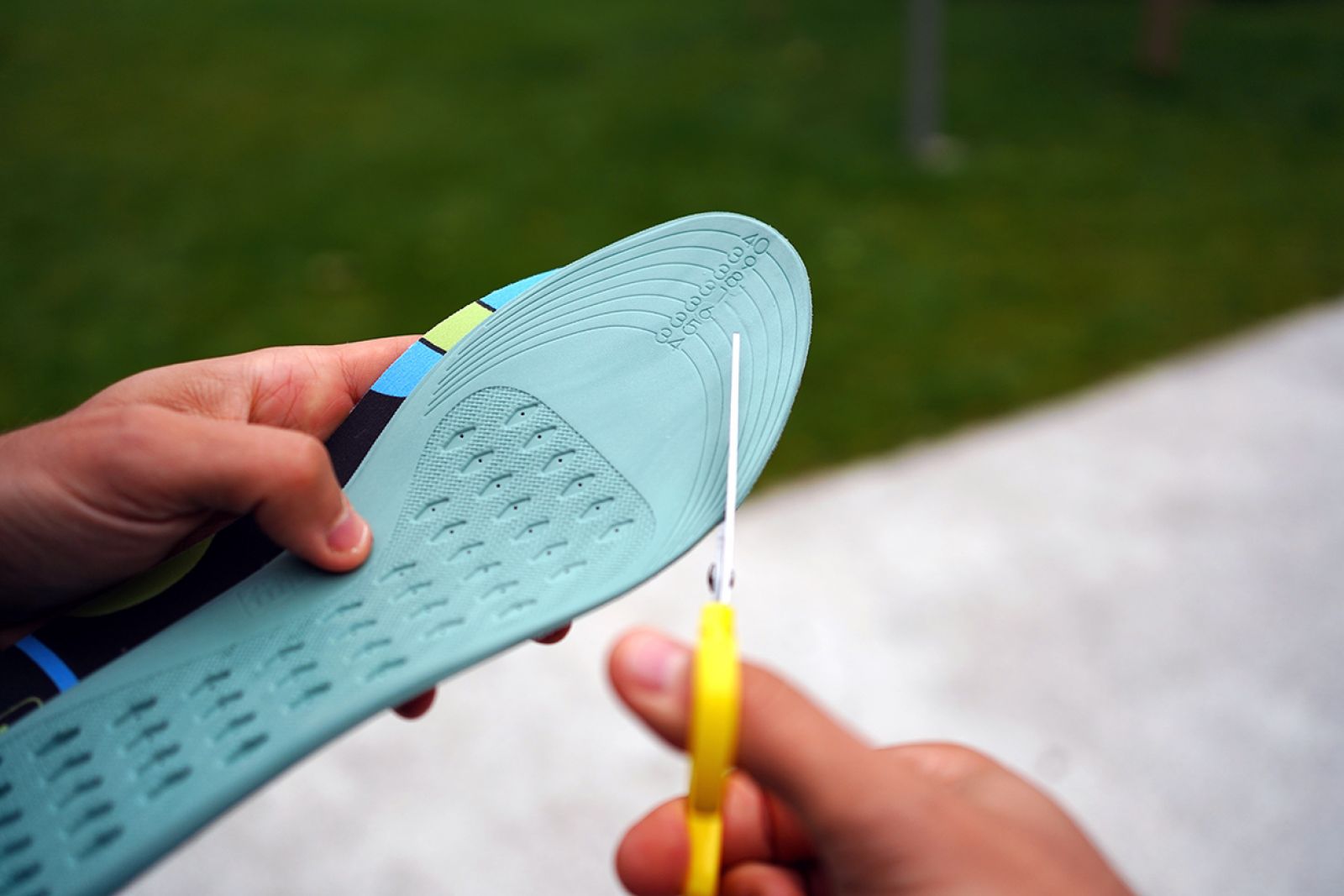 Podľa naznačených veľkostí upravte strihaním obidve vložky. Odporúčame odstrihnúť veľkosť o jedno číslo menšiu ako bežne nosíte, aby sa vložky v topánkach nekrčili a netlačili. Následne ich vložte do topánok farebnou časťou navrch. Strihanie vložiek do topánok POSTURE nemá žiaden vplyv na ich účinok.